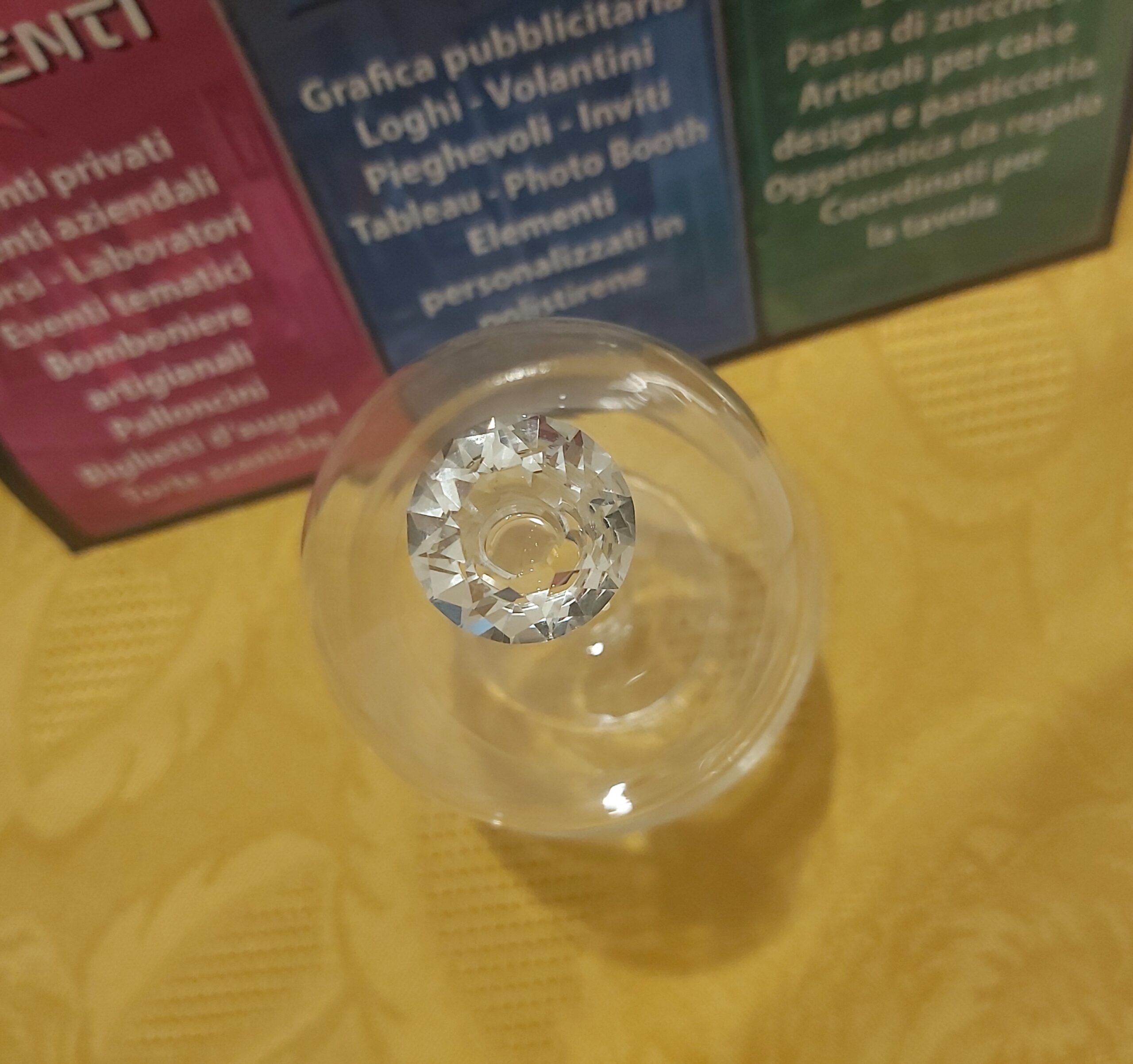 In vetro, ultimo pezzo, composto da due elementi: base piĂ¹ coperchio con bottone luccicante.