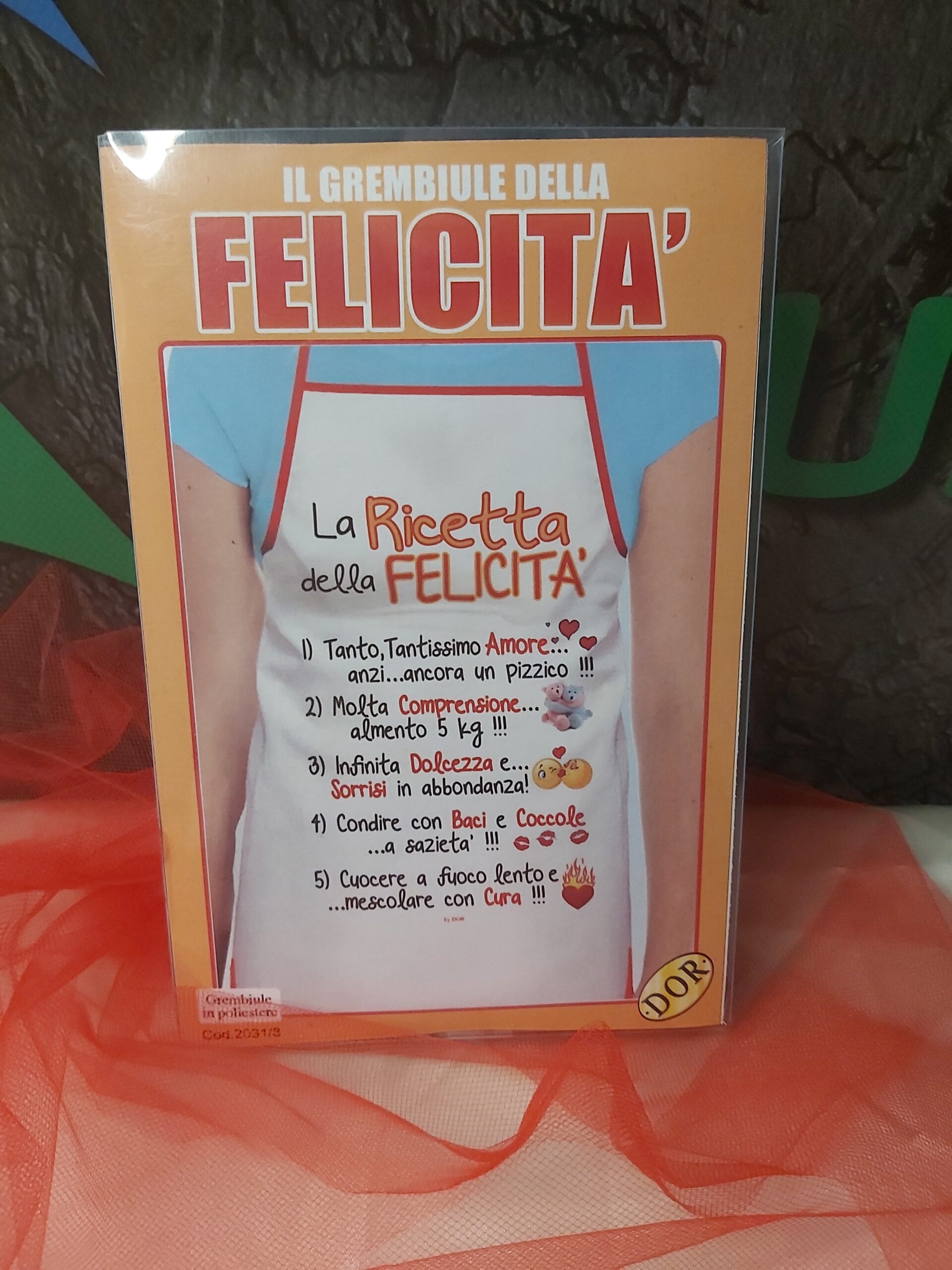Simpatico grembiule con annesse istruzioni sulla felicità ma soprattutto sull’Amore.